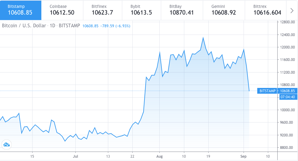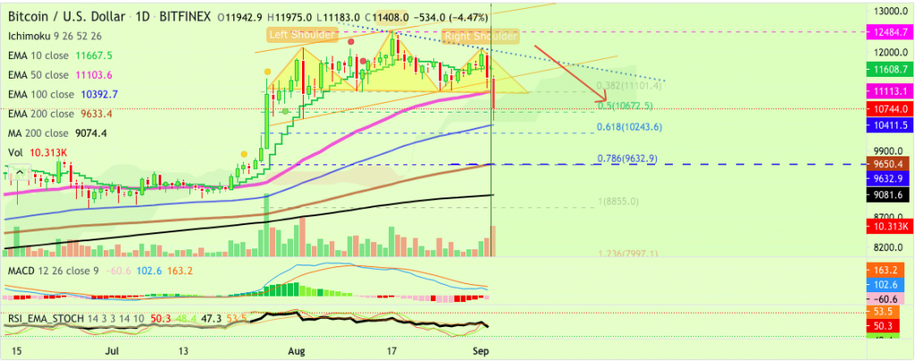 Bitcoin roi des cryptomonnaies, a connu une forte hausse après barre Bitcoin 11 700 $ le 1er septembre, suite à deux figures de retournement en épaule-tête-épaule à court terme. Sa réputation de « roi des cryptomonnaies » est bien méritée. Qu'il s'agisse des gros investisseurs institutionnels ou des fluctuations bien connues, chaque pic de prix comporte son lot de risques pour les traders. Le 2 septembre 2020, Bitcoin a continué de chuter, sans qu'il ne trouve de soutien.
