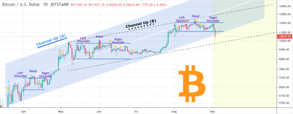 En analysant l'évolution du prix le 2 septembre, Trading Shot explique que la cryptomonnaie pourrait repartir à la hausse si une combinaison de mouvements se produit. Cependant, il a égalementdentune figure en épaule-tête-épaule. Shot estime que le mouvement actuel du prix Bitcoin correspond à une figuredentà celle formée le 3 août 2020.