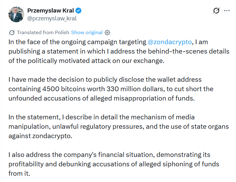 Il réitère sa position de longue date critiquant la loi d'application de MiCA, qu'il juge excessivement restrictive et destructrice pour le marché, et exige des excuses de Tusk, menaçant de le dénoncer au parquet pour diffamation et utilisation abusive des données ABW.