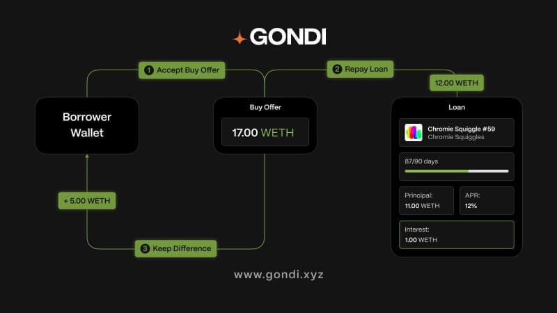 - Sell & Repay, allowing borrowers to accept buy offers made at other marketplaces or natively at Gondi, to repay the owed amount of a loan and keep the difference.