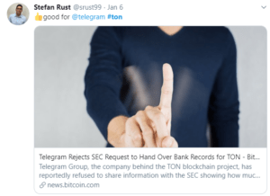 Telegram, reportedly after garnering over a billion dollars through token sales in 2018, was alleged to be illegally conducting the sales. The court case has led to Telegram postponing the launch of its anticipated TON blockchain scheduled for November 2019. It also resulted in the deposition of Telegram founder, Parel Durov, alongside two senior employees to be carried out in January 2020.