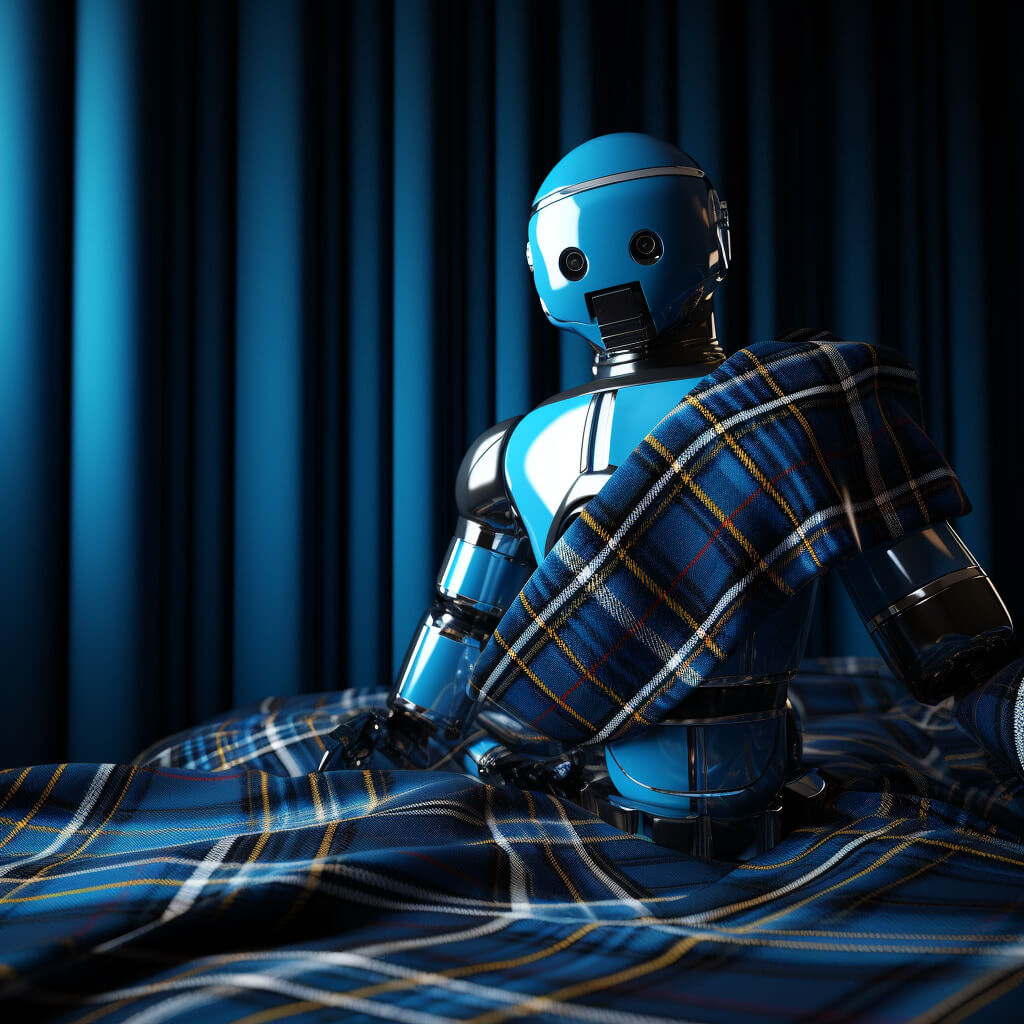 Beyond the creation of this distinctive tartan, Steven Sim’s collaboration with AI extended to the realm of visual representation. He utilized ChatGPT to generate sci-fi-inspired images featuring robots adorned in the AI Tartan, set against electronic cities reminiscent of circuit boards. These images serve to enhance the concept of the tartan as a symbol of technological advancement and innovation.