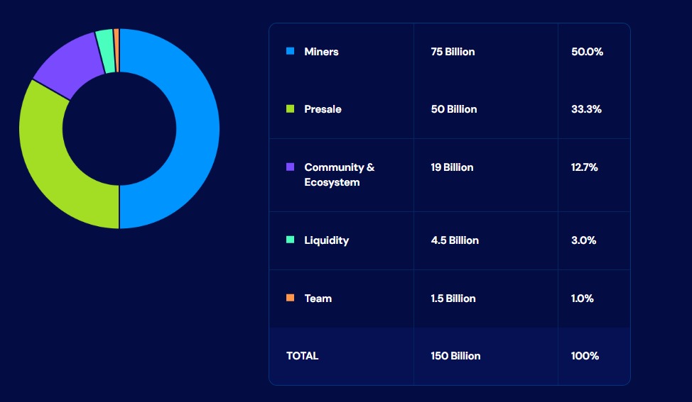 - A total supply of 150 billion tokens, with 50% allocated to miners