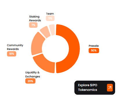 IPO Genie ($IPO) has a 437B total supply, with 50% allocated to the presale. The remaining supply is split across 20% liquidity, 18% community rewards, 7% staking, and 5% team tokens (locked).