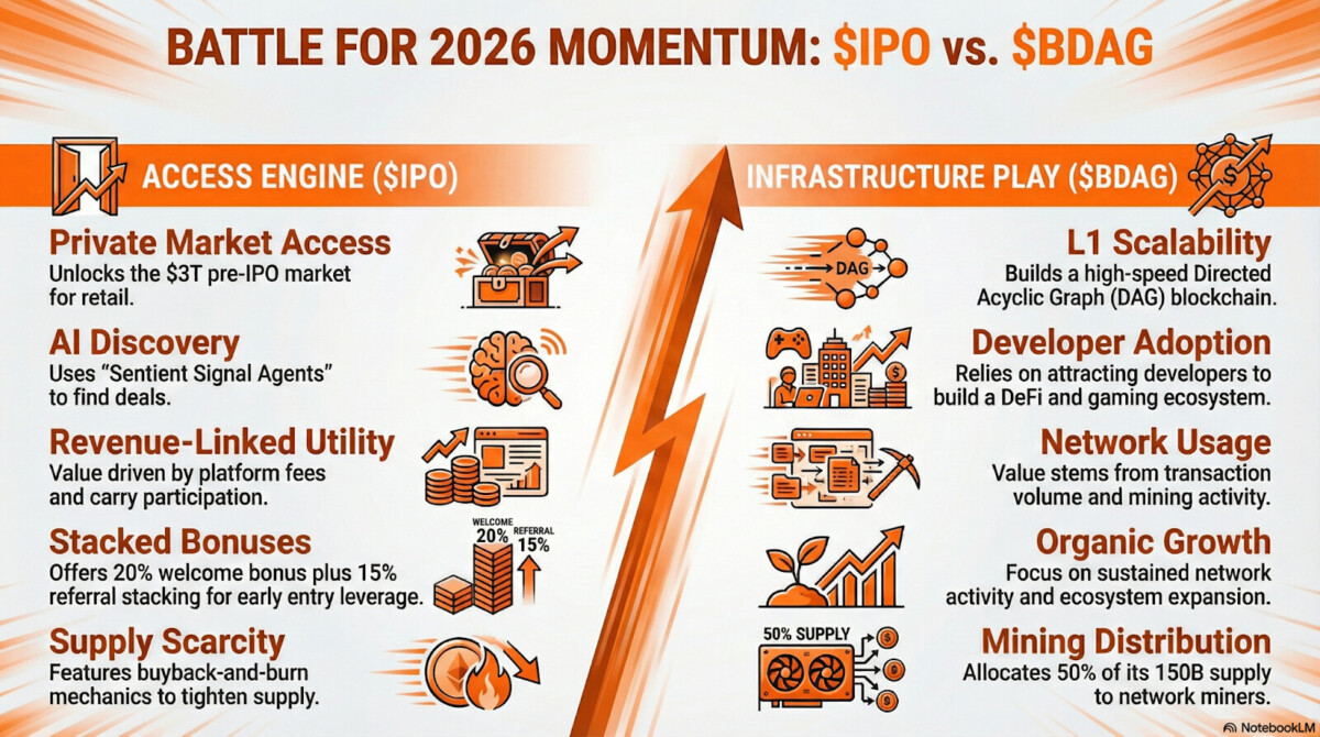 Before going deeper, the difference between $IPO and $BDAG is simple: access-driven demand versus adoption-driven growth.