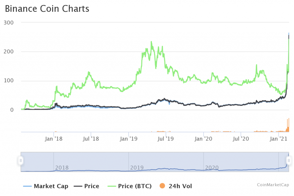 Secondo Coinmarketcap , Binance Coin è attualmente scambiata a 253 dollari, con un aumento del 39,4% nelle ultime 24 ore e del 103,4% negli ultimi sette giorni. Con una fornitura circolante di 154.532.785 BNB , la criptovaluta ha una capitalizzazione di mercato di 39,1 miliardi di dollari. Si tratta di un record impressionante, a giudicare dal fatto che BNB aveva una capitalizzazione di mercato di circa 27 miliardi di dollari.