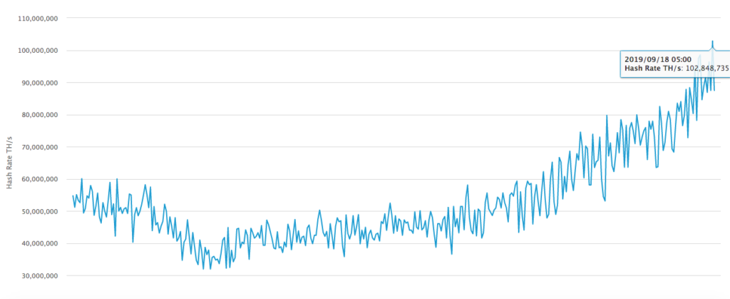 L'hashrate ha iniziato a salire a partire da maggio 2019 e, entro il 14 giugno 2019, aveva già raggiunto il precedente massimo storico di sessantamila miliardi di terahash (60 Exahash), ma non si è fermato lì e ha continuato a salire.