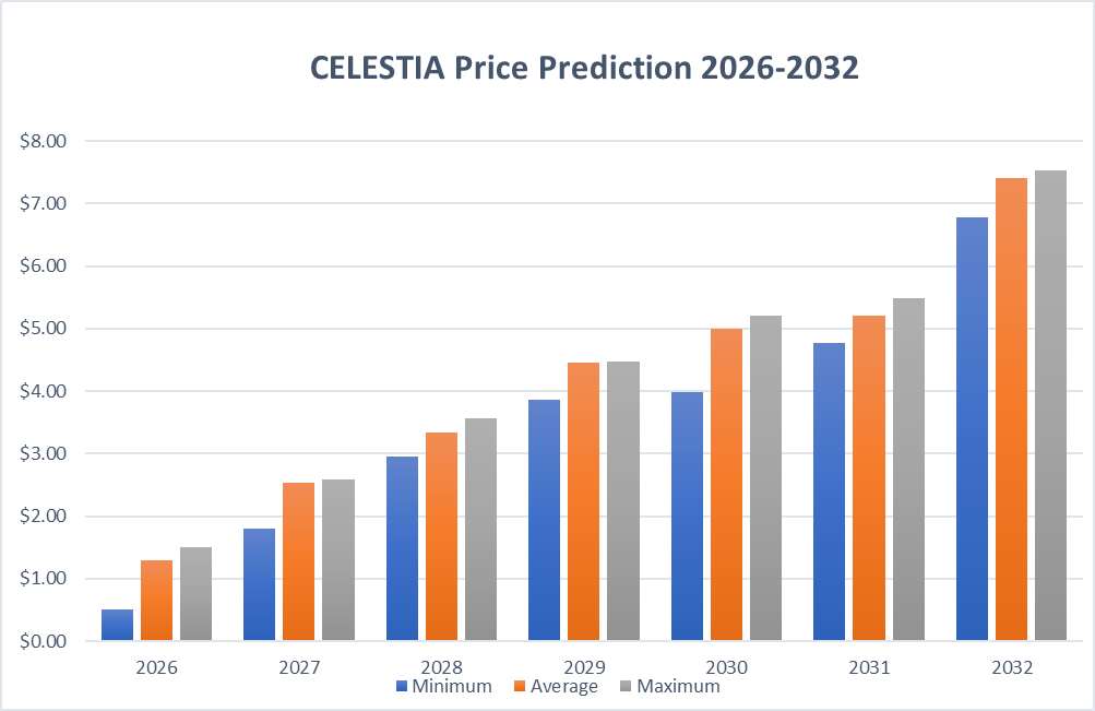 - La previsione del prezzo di Celestia per il 2026 suggerisce un prezzo massimo di 1,5 $.