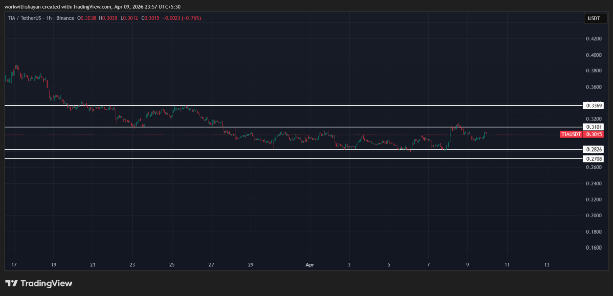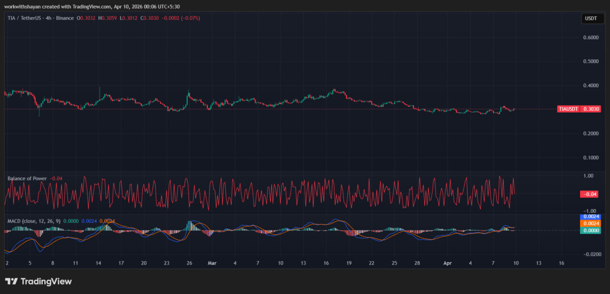 L'analisi del prezzo di TIA per il 9 aprile conferma che TIA sta subendo una volatilità ribassista verso il livello di $0,3. Attualmente, i venditori controllano il grafico dei prezzi, spingendo il prezzo verso i canali di supporto.