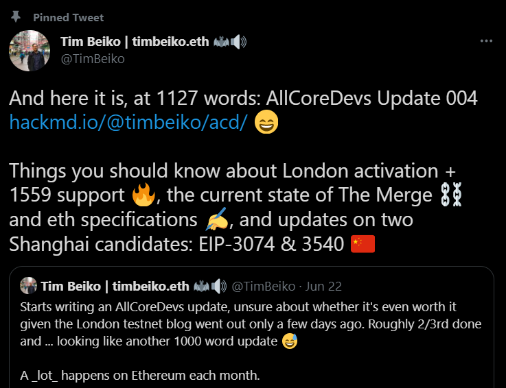 Con l'aumento dell'adozione di ETH, ci sono altre 2 testnet che saranno aggiornate con l'attivazione dell'hardfork di Londra. Questi aggiornamenti saranno disponibili il 20 giugno. Tim Beiko ha twittato che l'attivazione dell'aggiornamento ha richiesto tempo perché "il mining è altruistico su Ropsten"