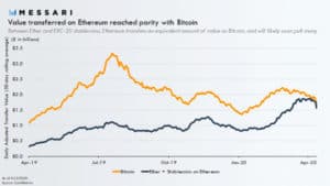 Gradualmente, il valore di trasferimento di bitcoin Ethereum . Questo andamento è continuato fino a quando Bitcoin ed Ethereum non hanno raggiunto la parità. Alle stablecoin ERC-20 è stato attribuito il merito di questa enorme crescita, poiché il loro valore giornaliero Ethereum trasferito è aumentato fino all'80%.