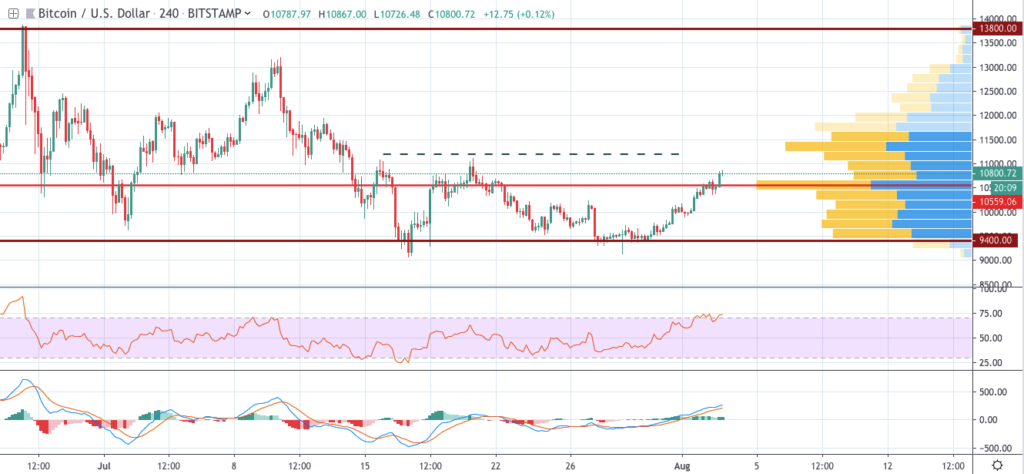 Man mano che il prezzo saliva al di sopra della zona di resistenza, il suo prezzo è aumentato costantemente e da allora è aumentato di oltre il cinque percento (5%), attestandosi sopra la soglia dei diecimilaottocento dollari ($ 10.800).