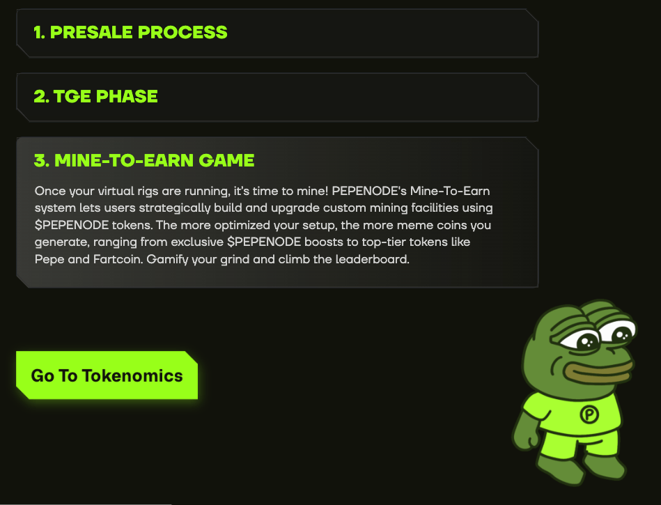 Oltre al gameplay, di PEPENODE rivelano ambizioni più grandi. L'offerta totale è limitata a 210 miliardi di token e il team ha fatto in modo di non avere vendite private o vantaggi riservati agli insider, garantendo a tutti i partecipanti alla prevendita la parità di trattamento.