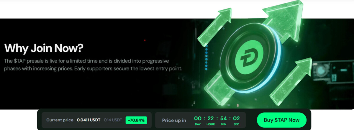 Uno dei motivi per cui Digitap sta attirando l'attenzione è il suo modello di prezzo di prevendita. $TAP ha attualmente un prezzo di circa $0,0411, con un prezzo di listino confermato di $0,14.