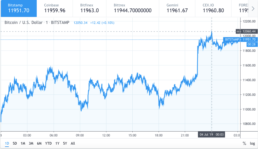 Bitcoin価格は、GMT午前0時(日本時間午前12時)に再び1万2000ドル(1206ドル)の大台を突破しました。しかし、暗号通貨の王者はこの水準を維持できず、本稿執筆時点では1万1951ドル(11951.70ドル)で取引されています。