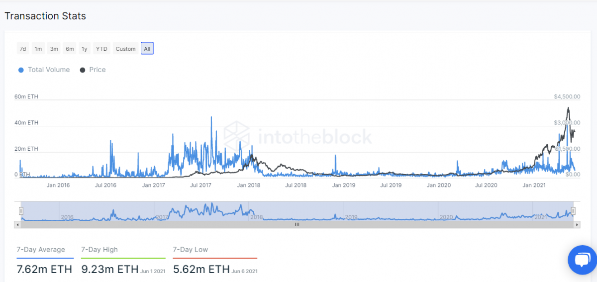 5月中旬に始まった下落により、取引数はわずかに減少しました。6月15日時点での取引数は122万4千件で、下振れ傾向を示しています。一方、 Ethereum ファンダメンタル分析によると、取引量はわずかに増加し、562万件に達しています。.