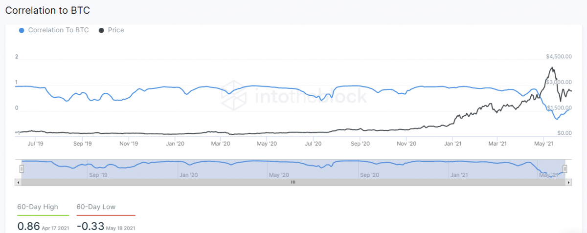 相関データは必ずしもコインの価格動向を予測するのに役立つわけではありません。 Ethereum の価格は変動の激しい時期には Bitcoin と連動しますが、安定期にはそうはいきません。 Ethereumの価格は、BTCが低迷していた DeFi ブームの時期に上昇しました。そのため、相関データは鵜呑みにしないことが重要です。.