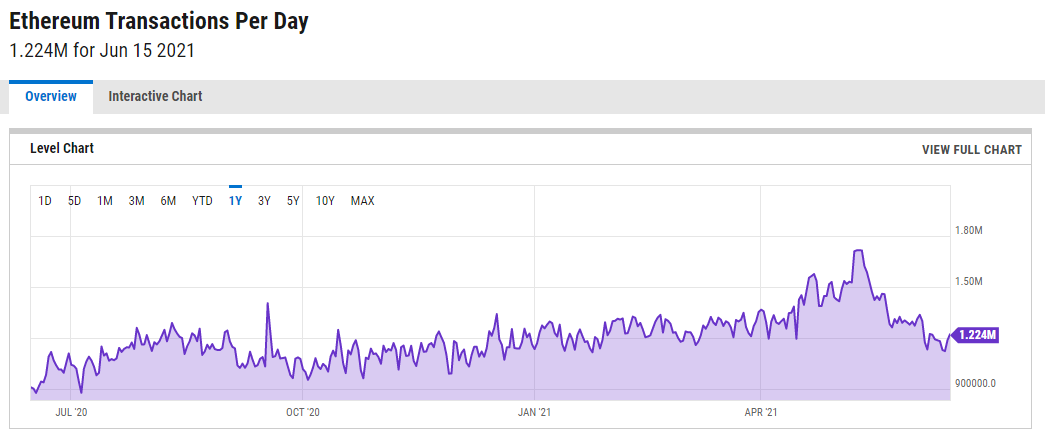 Ethereum トランザクション数は、ネットワークのリアルタイムのアクティビティを測る優れた方法です。このチャートは、 Ethereum トランザクション数が過去1年間で徐々に増加していることを示しています。トランザクション数は5月12日に117万件でピークに達し、暗号資産業界における非常にポジティブなセンチメントを後押ししました。.