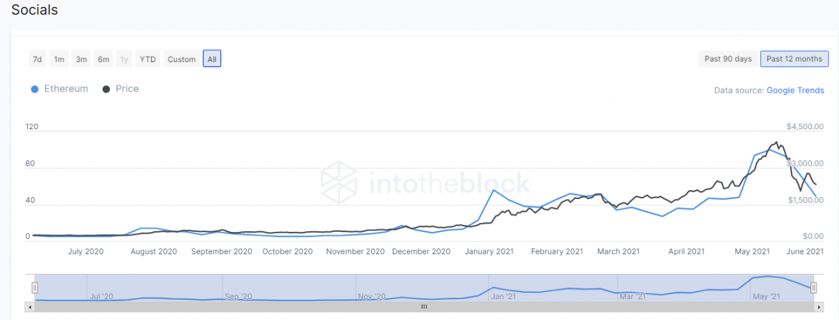 ソーシャルメディアのチャートを見ると、ETHに関するオンラインインタラクションは5月中旬にピークに達し、その後減少傾向にあることがわかります。この減少は、暗号資産市場全体のセンチメントの低迷に起因していると考えられます。.