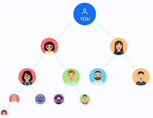 ダウンラインが無制限ということは、あなたの紹介ネットワークを数千人のユーザーへと拡大できることを意味します。紹介者が何レベル下であっても、新規ユーザーをNominexに招待すると、その新規ユーザーはmaticにあなたのネットワーク、つまりバイナリツリー(動画)に参加します。このツリーでは、レベル1に2人のユーザー、レベル2に4人のユーザーがいます。