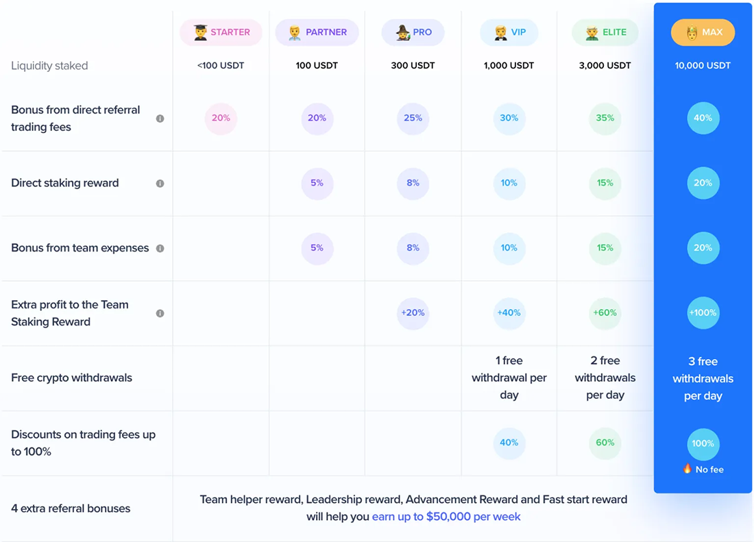 - 収益性の高い紹介プログラム:既に説明しましたが、優秀なチームリーダーは週に最大50,000 USDTを獲得できることも付け加えておきましょう。また、パートナープログラムでトップレベルに到達すれば、無料で取引(メイカー/テイカー手数料ゼロ)することも可能です。