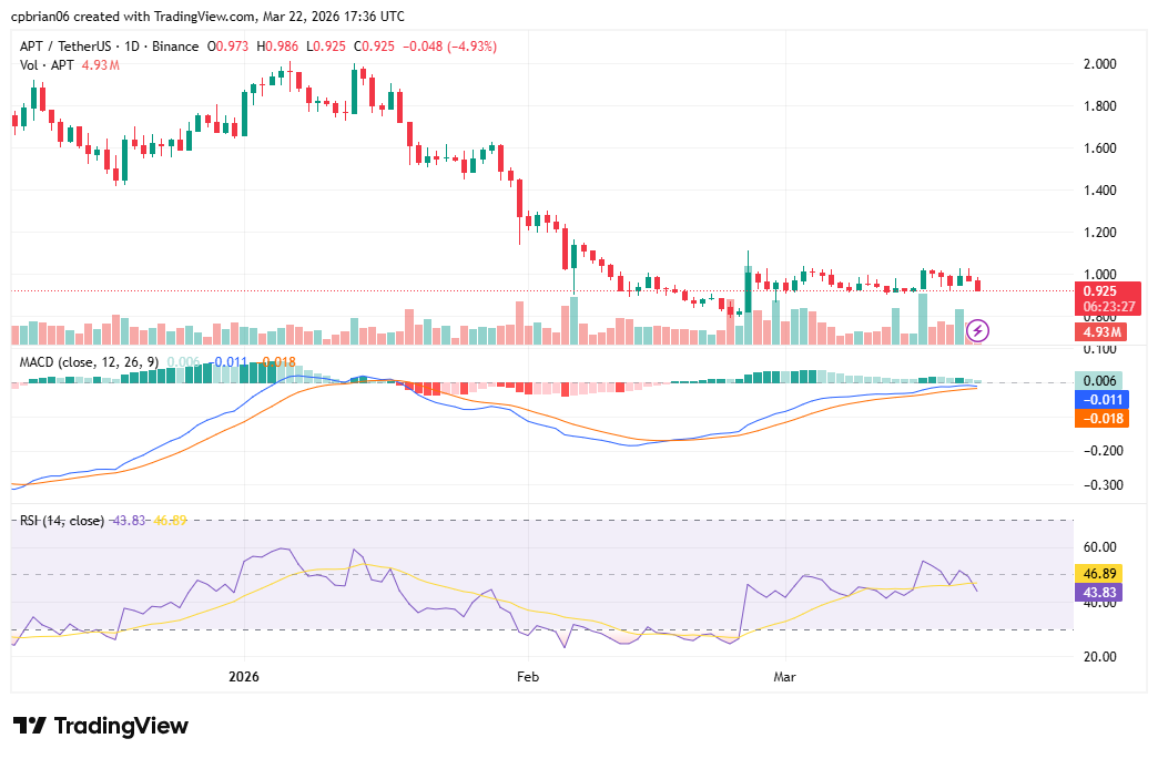 기술적 지표에 따르면 APT는 하락세입니다. 단기적으로 차트는 PT가 0.91달러 지지선에 근접하고 있음을 보여줍니다.