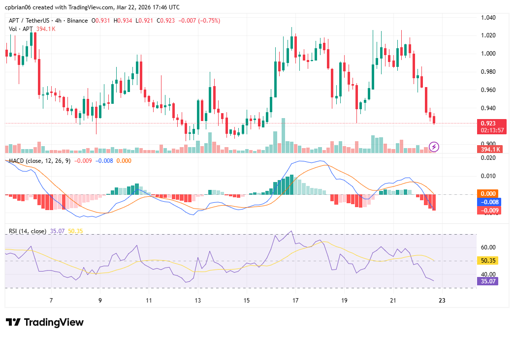 일봉 차트와 달리 4시간봉 차트는 하락세를 보여주고 있습니다. APT는 0.91달러에서 1.02달러 사이에서 등락을 반복하며 변동성이 컸는데, 이 가격대가 주요 지지선과 저항선 역할을 하고 있습니다. MACD 히스토그램은 지난 20시간 동안 하락 모멘텀이 강해졌음을 나타냅니다.