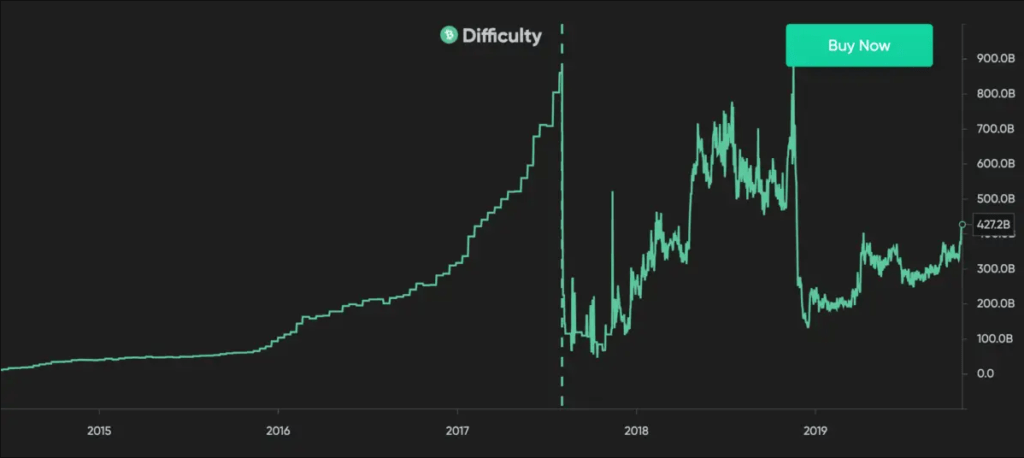 2017년 8월 1일, Bitcoin 코인 캐시(Bitcoin Cash 체인이 분리되면서 난이도가 불규칙적으로 변했습니다. 초기에는 차이가 매우 컸지만, 2018년 11월 Bitcoin SV) 분리 이후에는 그 차이가 줄어들면서 큰 폭의 하락세를 보였습니다.