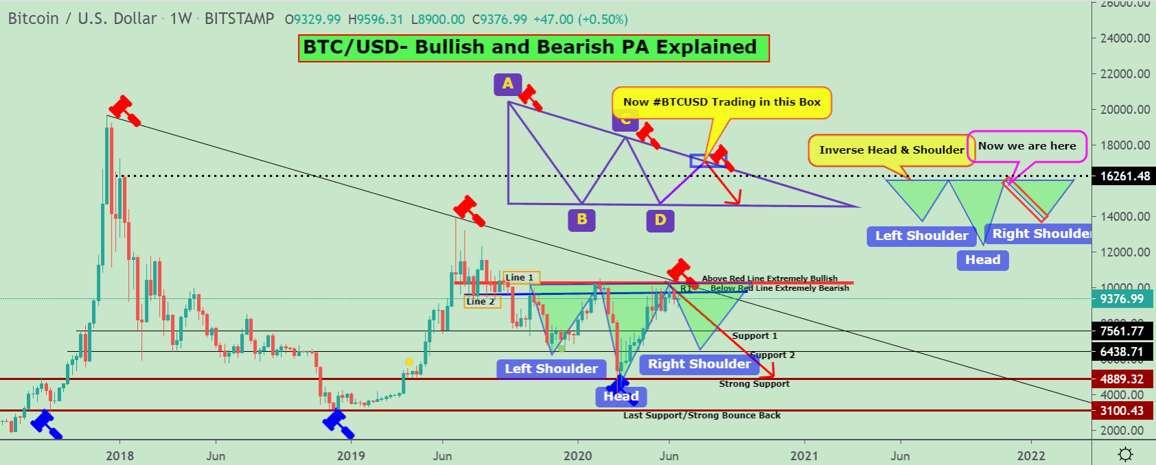 Bitcoin 가격은 9,300달러에서 9,400달러 사이에서 계속 고전하고 있습니다. 트레이딩뷰의 암호화폐 분석가인 크립토 파텔은 BTCUSD가 차트에서 역헤드앤숄더 패턴을 형성할 가능성이 있다고 예측했습니다.