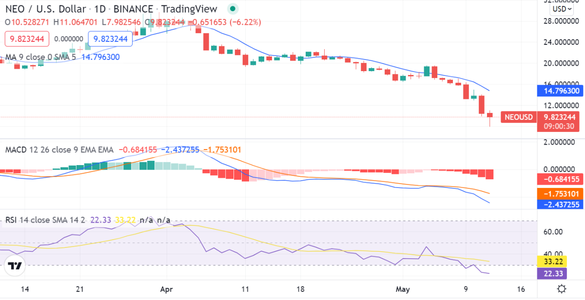 일일 가격 분석 차트는 현재 9.51 부근에서 거래되고 있습니다. 네오 토큰은 5월 초 21달러까지 급등하며 상승세를 보였으나 최근 며칠간 하락했습니다. 현재 시장은 8.56달러 지지선까지 하락 추세를 이어가고 있습니다. 가격이 10.09달러까지 상승하려면 이 수준을 돌파해야 합니다. 반대로 이 지지선 아래로 하락할 경우 네오 가격은 7달러까지 떨어질 수 있습니다.