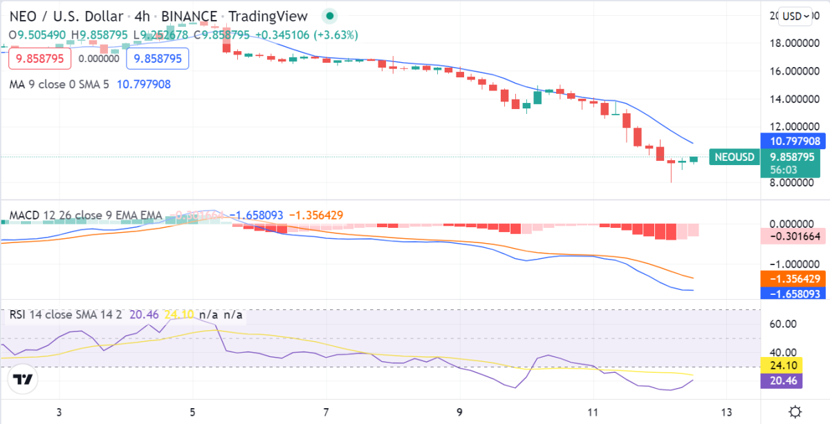 네오(NEO) 가격 결과, 현재 시장은 하락 추세에 있으며 NEO/USD 쌍은 8.56달러 지지선을 테스트하고 있습니다. 저항선은 13.21달러에 위치해 있습니다. 매수세가 시장을 장악하지 못함에 따라 향후 며칠 동안 약세장이 지속될 것으로 예상됩니다. 10달러 선이 가까운 시일 내에 저항선 역할을 할 수 있습니다. 8.56달러 지지선 아래로 하락할 경우 네오 가격은 7달러까지 떨어질 가능성이 있습니다.