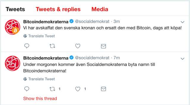 해커는 일생일대의 기회를 포착하여 트위터 계정을 이용해 가짜 bitcoin 홍보했습니다. 사회민주당 트위터 계정은 Bitcoin 이제 스웨덴의 국가 통화이며 기존 화폐가 bitcoin 으로 대체되었다는 트윗을 올렸습니다.