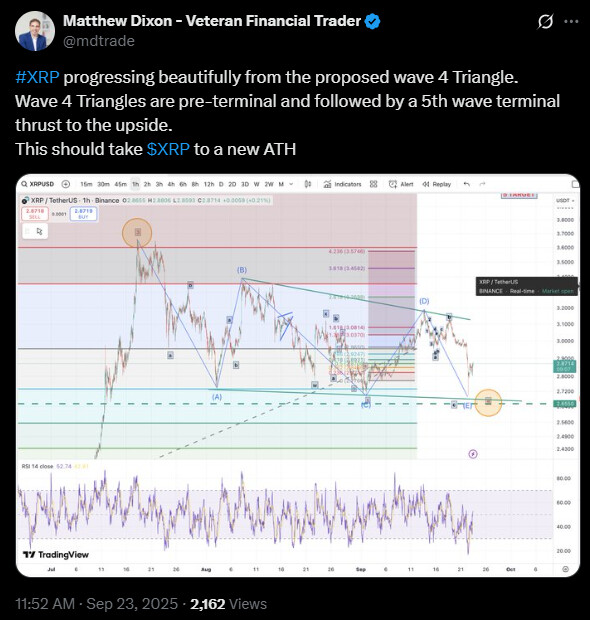 분석가 매튜 딕슨은 XRP 의 "4차 파동 삼각형"이 큰 움직임을 촉발할 수 있다고 믿습니다 XRP 사상 최고치를 경신할 가능성까지 예상하고 있습니다.