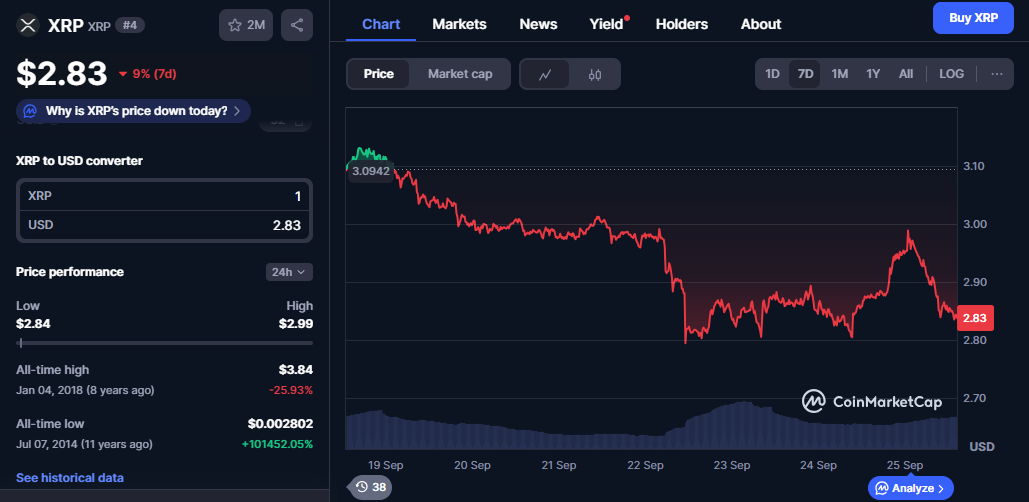 XRP ETF 유입에도 불구하고 2.83달러까지 하락: 반등 가능성은 있을까?