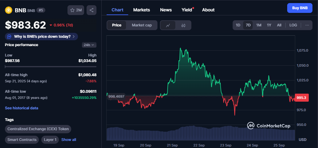 BNB 도약하지 못하고 있습니다. 2025년 9월 21일 사상 최고가인 1,080달러를 기록한 후, 며칠 만에 거의 8% 가까이 하락했습니다. 현재 Binance 코인(BNB)은 차트에서 약 983달러 부근에서 거래되고 있습니다.