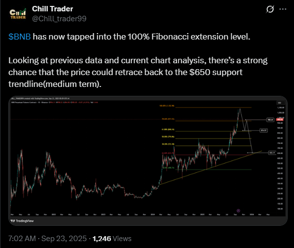 그리고 그 수준이 당분간 유지될 수도 있습니다. 애널리스트 칠 트레이더(Chill Trader)는 BNB 바닥을 쳤을 가능성이 있다고 경고합니다. 100% 피보나치 되돌림 수준에 도달했기 때문에 차트상으로는 중기적으로 650달러 지지선까지trac가능성이 있습니다. 이는 현재 BNB 가격에서 상당히 큰 폭의 하락입니다.