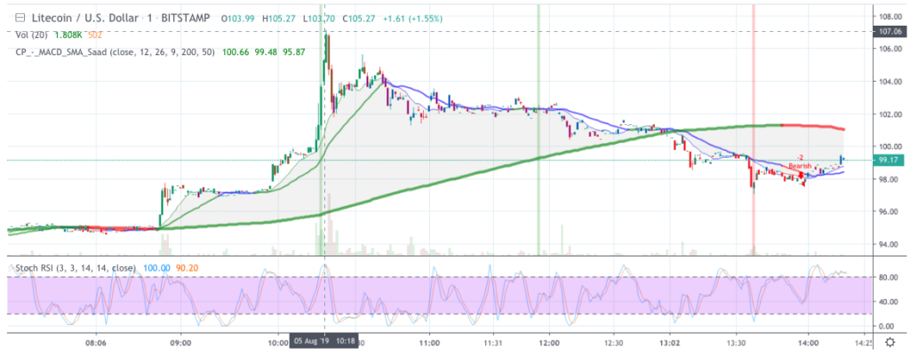 LTC managed to sustain the price above the hundred dollars mark for about three hours before the bearish trend took reins of the price trend and started dwindling below the mark.