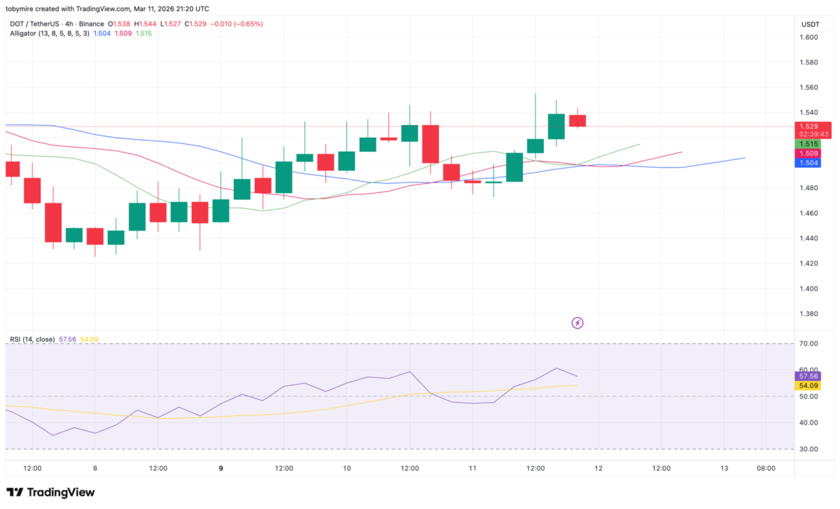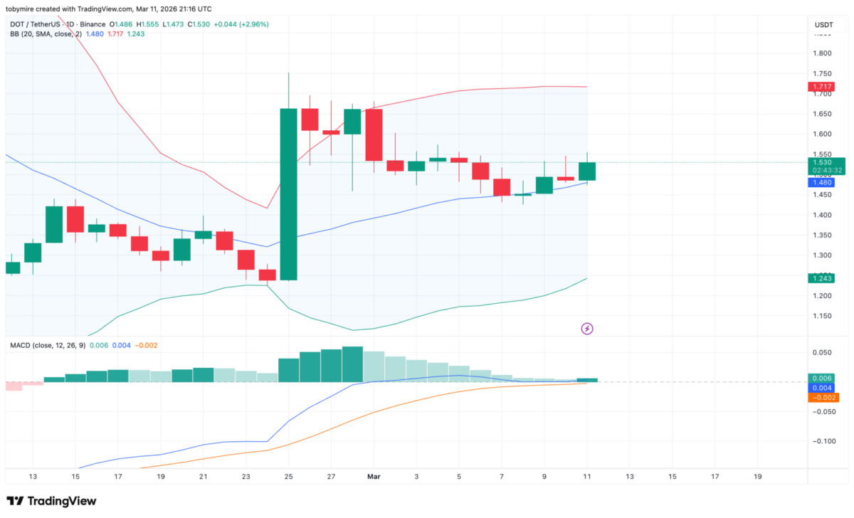 DOT trades at $1.530 on 11 March 2026, up 2.96% on the day, extending a rebound from the recent low near $1.45.