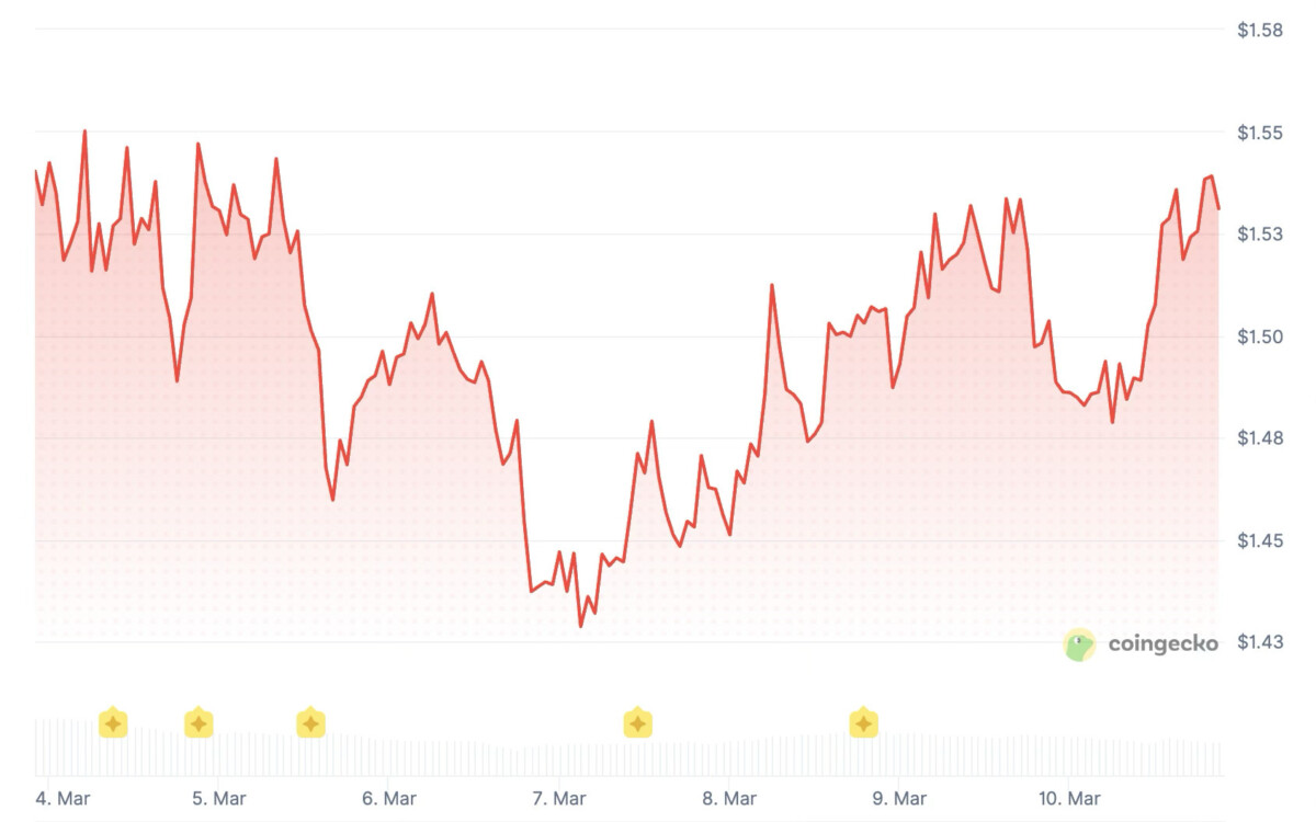 - The coin’s resistance stands at $1.55; support sits at $1.50–$1.48.
