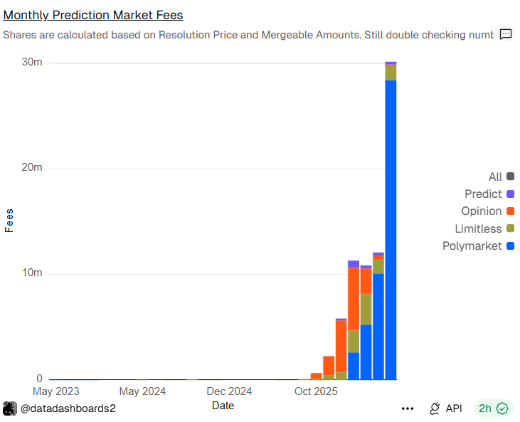 In April, however, Polymarket achieved peak fees of over $28M, based on Dune Analytics data.