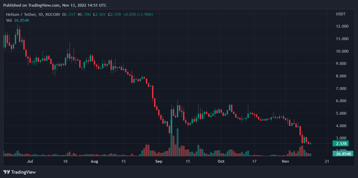 O valor do Helium não conseguiu melhorar, já que o mercado continua desfavorável. Os dados mais recentes mostram uma regressão de 1,16% no último dia. O desempenho semanal desta criptomoeda apresenta uma perda de 37,78%. O preço atual do HNT está na faixa de US$ 2,55.