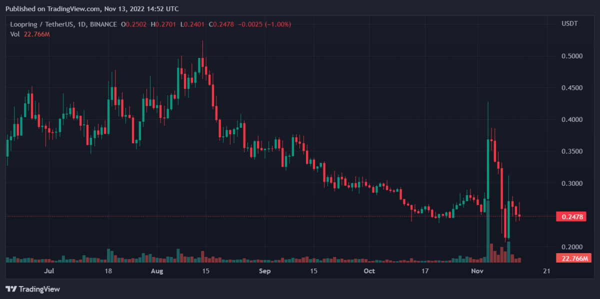 Loopring não se diferenciou do restante do mercado devido à conjuntura desfavorável. Os dados mais recentes mostram uma queda de 0,66% no último dia. O desempenho semanal indica uma perda de 33,13%. Essa queda considerável afetou o preço da LRC, que atualmente está na faixa de US$ 0,2481.