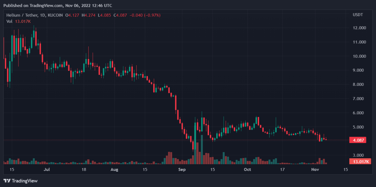 O valor do Helium também sofreu devido a uma tendência de baixa. Os dados mais recentes mostram uma queda de 2,62% no último dia. O desempenho semanal da criptomoeda apresenta uma valorização de 0,85%. O preço atual do HNT está na faixa de US$ 4,11.