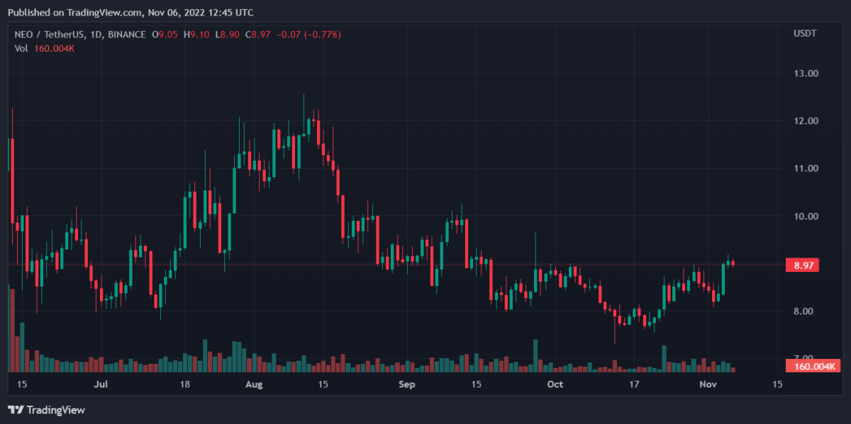 O valor do NEO também caiu nas últimas 24 horas. Os dados recentes mostram uma desvalorização de 1,41%. Já os dados dos últimos sete dias apresentam resultados diferentes, com uma queda de 3,39%. O preço atual do NEO está na faixa de US$ 8,98.