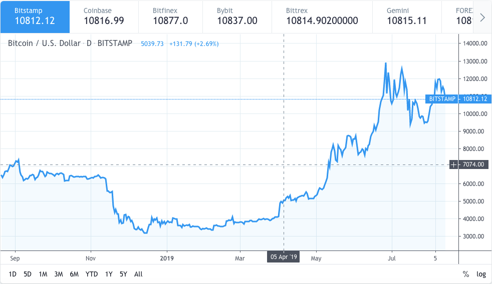 Anteriormente, Bitcoin era negociado a dez mil e oitocentos dólares (US$ 10.800) em 4 de agosto, após o que o preço subiu para mais de doze mil dólares (US$ 12.000).