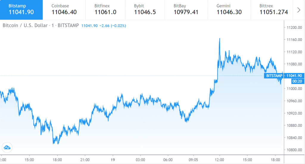 A criptomoeda atingiu a máxima do dia de US$ 11.167,07, enquanto a mínima foi de US$ 10.818,83. No momento da redação deste texto, Bitcoin estava cotado a US$ 11.041,90 na Bitstamp.