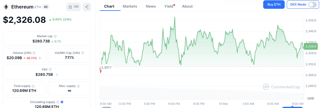Ethereum estava sendo negociado em torno de US$ 2.326,08, com alta de 0,69% nas últimas 24 horas, e a movimentação intradiária ficou limitada a aproximadamente US$ 2.307-US$ 2.350. Essa faixa de preço deixou o mercado em consolidação, com repetidas tentativas frustradas de romper a resistência próxima à zona de US$ 2.340-US$ 2.350 e um suporte visível em torno de US$ 2.310.