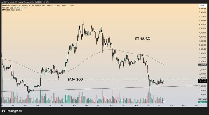 Ethereum se estabiliza abaixo da zona de suporte da EMA de 200/Fonte: X