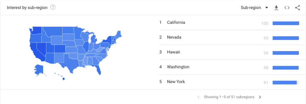 Atualmente, nos Estados Unidos, o índice de buscas na internet Bitcoin é de apenas sete, enquanto Califórnia, Nevada, Havaí, Washington e Nova York são os cinco estados que mais pesquisam por Bitcoin nessa ordem.