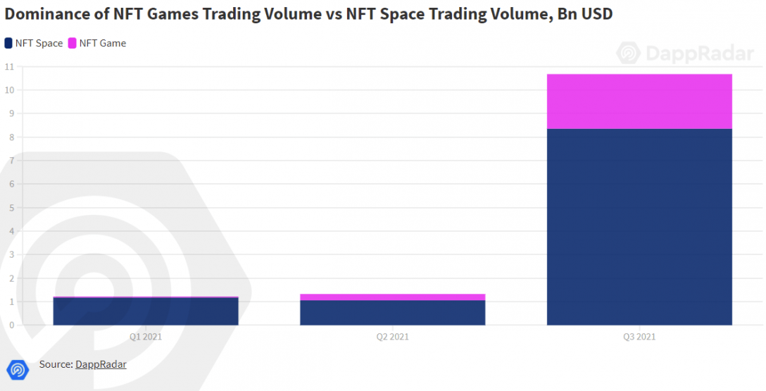 - Os jogos NFT registraram um volume de negociação de US$ 2,32 bilhões no terceiro trimestre, um aumento de 762% em relação ao trimestre anterior.